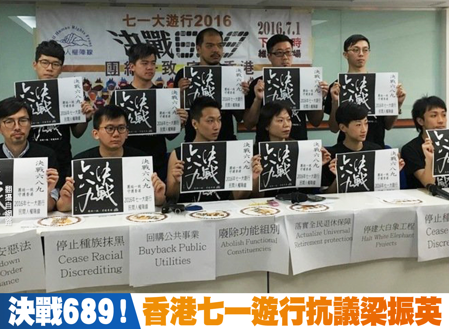 今年七一大遊行,香港民間人權陣線(民陣)以「決戰689」為主題,並由銅鑼灣書店店長林榮基帶領遊行隊伍,抗議特首梁振英,守護香港核心價值。預估遊行將有10萬港人參與。