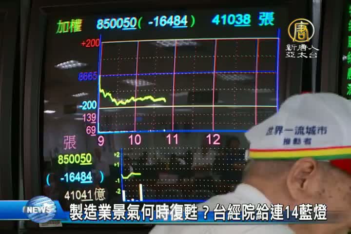【新唐人亞太台 2016 年 06 月 30 日訊】歡迎回來,台經院今天(30日)發布5月製造業景氣燈號,來到連續第14個藍燈,因為全球景氣仍不明朗,5月製造業的原物料進口與股價指數表現不佳、持續負成長,台經院給出連14顆藍燈,並創史上最長,破了2008年7月連11顆藍燈的記錄。