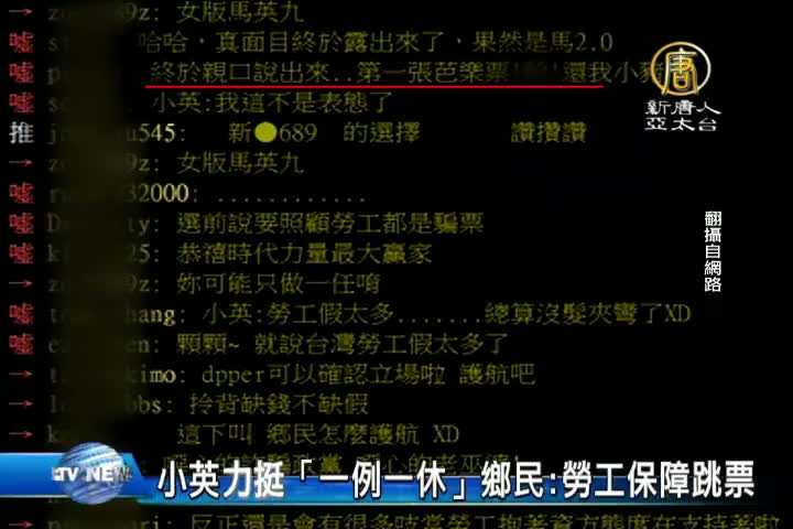 【新唐人亞太台 2016 年 06 月 30 日訊】正在巴拉圭出訪的蔡英文總統,與媒體茶敘時力挺「一例一休」,認為這是行政院努力要把週休二日落實的做法,「是進步的立法」,不過,網友的反應卻是一片噓聲,PTT鄉民留言,「終於親口說出來…第一張芭樂票」、「選前說要照顧勞工都是騙票」、「第一次噓蔡英文,勞工這塊真讓人失望」,還有鄉民質疑,選前蔡英文提出的「勞工6大保障」政策已正式跳票。