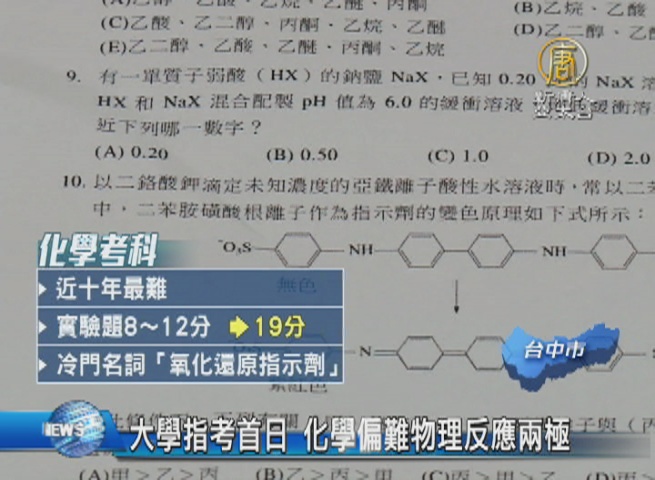 【新唐人亞太台 2016 年 07 月 01 日訊】大學指考今天登場,共5萬多人報考,創下歷史新低,第一天考物理、化學跟生物,補教老師就分析,物理考題難易度偏簡單,但化學可是近10年最難的一次。
