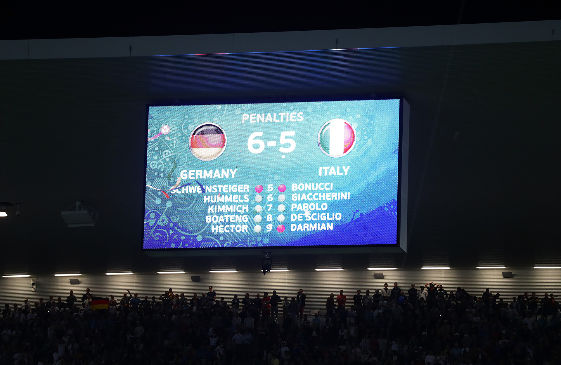 【新唐人亞太台 2016 年 07 月 03 日訊】歐洲國家盃足球賽8強賽,德國中場厄齊爾在第65分鐘替德國隊先下一城,但義大利後衛波努奇隨後在第78分鐘罰踢破網,戰成1比1平手。打完正規賽與30分鐘延長賽,雙方仍是1比1平手,進入PK戰。在PK賽中,罰踢第二點的穆勒,平推球被義大利門將布馮擋下。罰踢第三點的厄齊爾雖然騙過布馮,但是球卻正中右門柱彈出。在2比2平手時,罰踢第5點的小豬施魏因斯泰格射飛,最終德國隊後衛赫克特踢進致勝球,德國以6比5擊敗義大利,晉級4強,也終於破除國際正規賽贏不了義大利的魔咒。