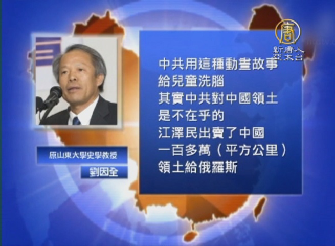 原山東大學史學教授劉因全:「中共用這種動畫故事給兒童洗腦。其實中共對中國領土是不在乎的,江澤民出賣了中國一百多萬(平方公里)領土給俄羅斯,還有其他國家好多領土本來是中國的,包括印度、緬甸等等。」