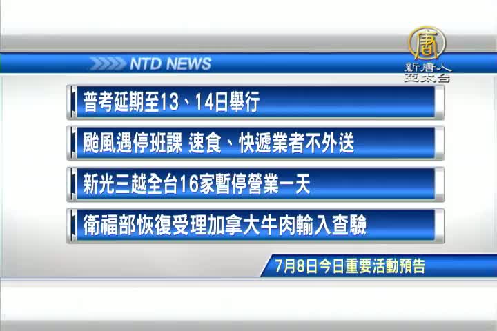 【新唐人亞太台 2016 年 07 月 08 日訊】接著看到,今天,7月8日,星期五,有哪些重要活動。首先是強颱尼伯特來襲,原定今、明兩天舉行的公務人員普考,延期到13、14號舉行,另外提醒您,颱風天停班停課,速食業、快遞業一律禁止外送服務;再來是,全台各縣市今天都放颱風假,新光三越百貨宣布全台16家分館都暫停營業一天;最後是生活資訊,自即日起,衛福部要恢復受理加拿大牛肉輸入查驗。