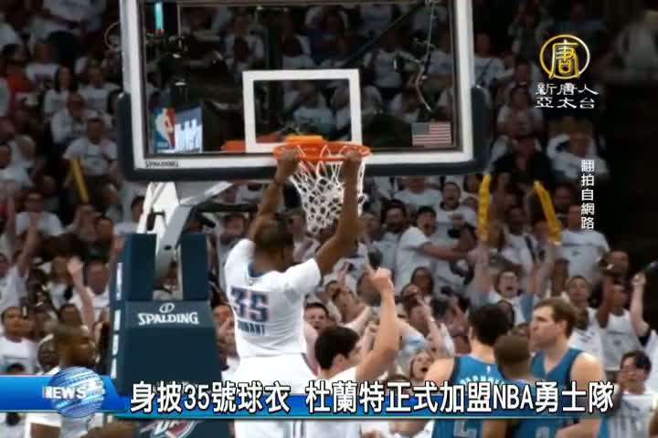 【新唐人亞太台 2016 年 07 月 08 日訊】NBA著名球員凱文·杜蘭特今天正式加盟金州勇士隊,杜蘭特和勇士隊教練柯爾一同出席記者會,他也將繼續身披 35號戰袍。
