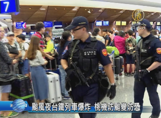 【新唐人亞太台 2016 年 07 月 08 日訊】「尼伯特」颱風襲台,大家都在看桃園機場怎麼防範,幸好目前沒有傳出災情,倒是昨天(7日)晚上松山車站列車爆炸,讓桃園機場維安,繃緊神經。航警局一早就派遣霹靂小組荷槍實彈,在各航廈間巡邏。