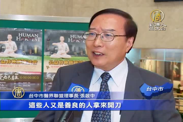 【新唐人亞太台 2016 年 07 月 09 日訊】華裔導演李雲翔執導的紀錄片《活摘》,紀錄兩位諾貝爾和平獎被提名人調查中共活摘良心犯器官、收集各種有力證據的影像紀錄,獲得多項國際影展成就;日前(7日)記錄片受到台灣人權文化協會及台中市醫界聯盟邀請,在台中大墩文化中心放映,希望將真相,傳播出去。