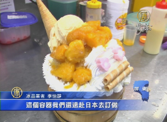【新唐人亞太台 2016 年 07 月 10 日訊】夏天是冰品的熱銷期,如何讓眾多冰品的競爭中脫穎而出,除了口味好吃,造型包裝如果多一些巧思,更容易受消費者青睞。屏東東港就有業者,用日式木桶來裝芒果刨冰,搭配可愛的人偶造型,驚艷的視覺和口感,很受民眾喜愛。