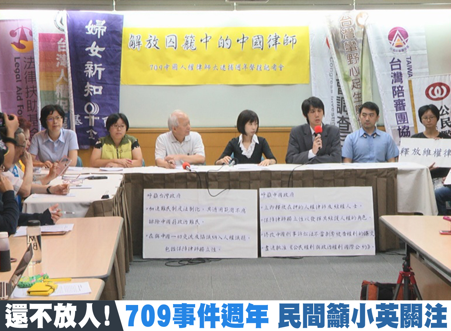 【新唐人亞太台 2016 年 07 月 12 日訊】中國維權律師遭大抓捕的709事件,剛屆滿一周年過,目前包括替法輪功學員辯護的王宇律師、王全璋律師等數十位律師,仍然被中共以顛覆國家政權罪,關押獄中。台灣多位政要和民團代表,今天都齊聲聲援,希望小英政府,挺直腰桿,向中共抗議。