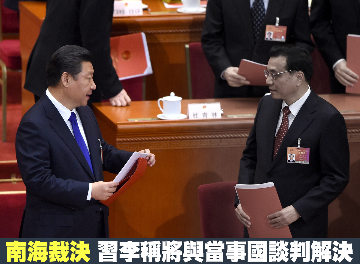 不過,中國領導人習近平,與國務院總理李克強週二會見歐洲領導人時罕見表態,習近平出席中歐峰會開幕,會見歐洲理事會主席圖斯克(Donald Tusk)和歐盟委員會主席容克(Jean-Claude Juncker)時分別表示,不接受南海仲裁案的結果。李克強也說,中方「不接受、不承認菲律賓南海仲裁案的所謂『裁決』」。不過兩人都承諾,將「通過談判協商和平解決有關爭議」。