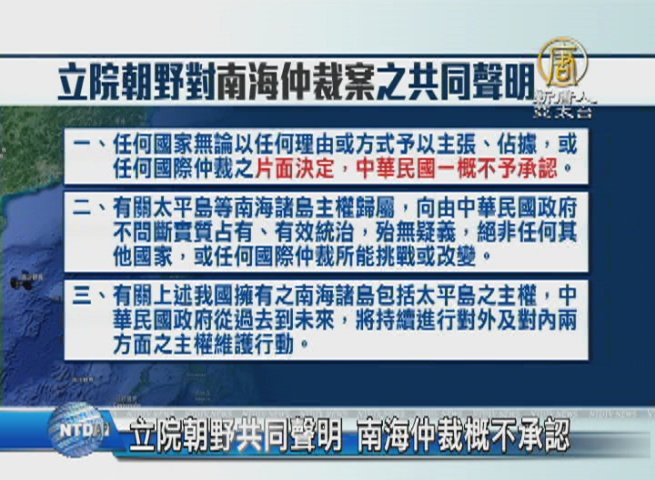【新唐人亞太台 2016 年 07 月 15 日訊】而針對南海仲裁案結果,立法院發表朝野黨團的共同聲明,嚴厲聲明仲裁的片面決定,中華民國一概不予承認,除此之外,國民黨團也要求總統到立法院報告,但趕在會期最後一天才提出,民進黨就批評國民黨,根本是要拖延不當黨產處理條例。