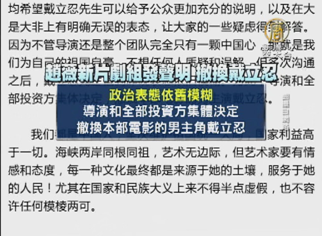 【新唐人亞太台 2016 年 07 月 15 日訊】由趙薇執導的新片,找來台灣演員戴立忍參與演出,但卻遭中國網友影射,是台獨份子,儘管戴立忍曾發文澄清,但劇組今天仍發出聲明表示,決定撤換戴立忍角色。