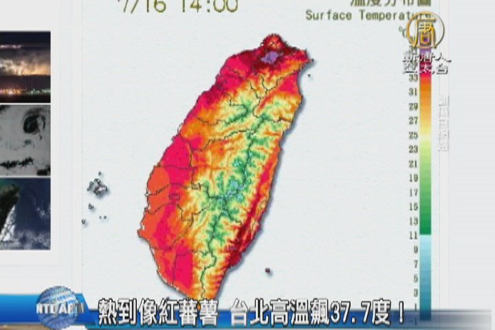 【新唐人亞太台 2016 年 07 月 16 日訊】今天天氣還是很熱,台北市在中午1點測到37.7度的高溫, 寫下台北7月最高溫,許多下午到新莊棒球場看中華職棒明星對抗賽的民眾,熱到直搧風。氣象局預報中心主任鄭明典,也在臉書貼出台灣像紅蕃薯的照片,指出全台高溫,大台北地區和花東縱谷特別的熱,明天水氣才會多一些。