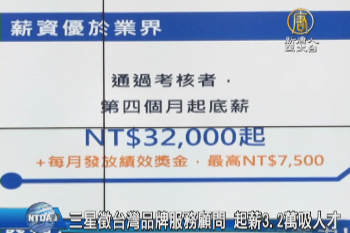 【新唐人亞太台 2016 年 07 月 16 日訊】看中台灣人才溝通特質,台灣三星開出15個起薪3.2萬的品牌服務顧問職缺,並在前三個月培訓期間,保障薪水4.5萬元,吸引優秀的台灣年輕人,投身全球前十大最有價值品牌的企業。
