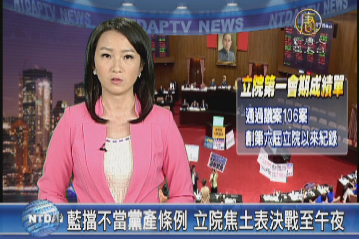 【新唐人亞太台 2016 年 07 月 16 日訊】昨天(7月15日)是立法院第一會期最後一天開會,國民黨團為了阻擋《不當黨產條例》三讀,採取焦土策略,長達9個小時的表決車輪戰下來,立法院長蘇嘉全在將近午夜12點宣布散會,雖然最後一天開會無法案三讀,但第9屆新國會第1會期通過106案,創下第6屆以來的紀錄。