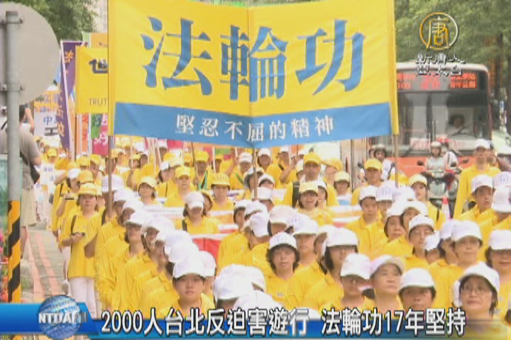 新唐人記者 巫亦晴:「週日下午,來自台灣各地近2千名的法輪功學員,聚集在台北101,舉行「聲援中國20萬人起訴江澤民」的720反迫害大型遊行。」
