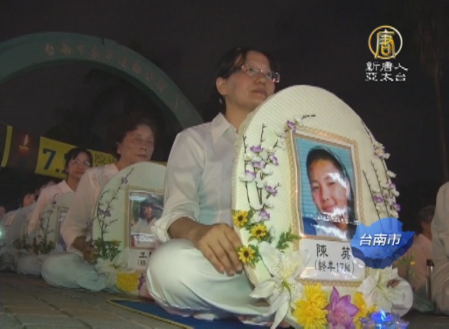 星期天的夜晚,在台南東寧公園,法輪功學員手舉著螢光,表情肅穆,有人哽咽,在追悼會音樂中,悼念17年來遭受中共殘酷迫害的法輪功學員。