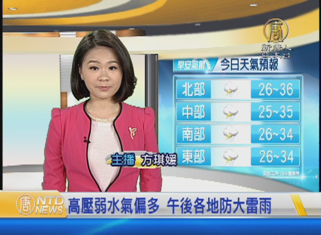 【新唐人亞太台 2016 年 07 月 19 日訊】歡迎您收看7月19日的早安新唐人,我是方琪媛。先來帶您關心今天的天氣情況。今天(19日)天氣與昨天相似,水氣偏多,白天氣溫高、陽光強,無雨時感覺悶熱,各地高溫約在32至36度。中午前後紫外線指數偏高,中南部、東部留意陣雨或雷雨,其他地區午後出現雷陣雨,短時間累積雨量可達大雨或豪雨等級,週四到下週一,因太平洋高壓勢力偏強,水氣將偏少,外出須注意防曬、補充水分防中暑。帶您一起來看到國際媒體重要訊息。