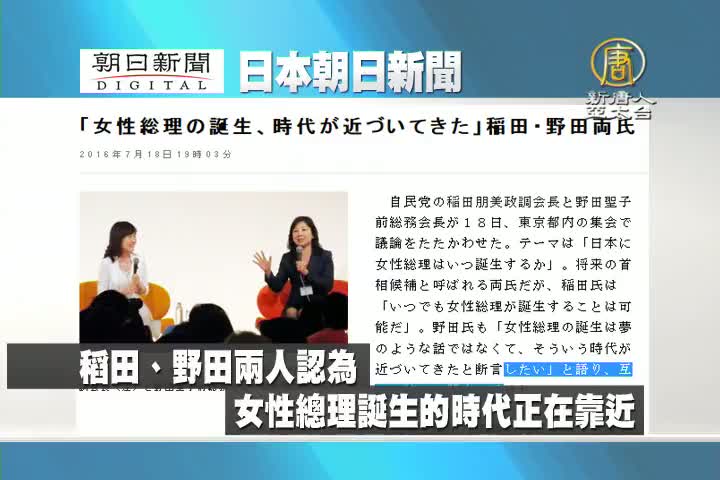 【新唐人亞太台 2016 年 07 月 19 日訊】來看到日本朝日新聞報導:日本自民黨 政調會長 稻田朋美 及 前總務會長 野田聖子 認為,日本正在靠近女性總理誕生的時代。