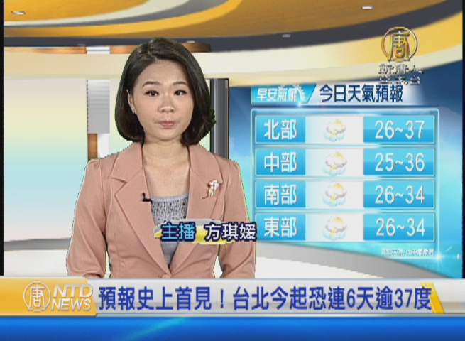 【新唐人亞太台 2016 年 07 月 20 日訊】歡迎您收看7月20日的早安新唐人,我是方琪媛。先來帶您關心今天的天氣情況。今天太平洋高壓逐漸增強,全台晴朗炎熱,中部以北高溫約35、36度,南部及東部高溫約33、34度,各地雖有午後雷陣雨,但雨勢及降雨範圍減少,而氣象局預報中心主任鄭明典 昨天在臉書上貼出預報氣溫,從今天開始到七月25日,一連六天,台北站的高溫預報都超過37度。他說,這是氣象預報史上 第一次的持續高溫預報。帶您一起來看到國際媒體重要訊息。