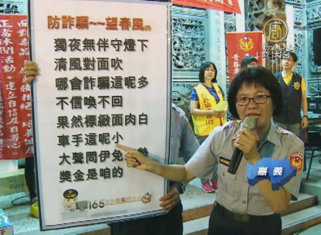 【新唐人亞太台 2016 年 07 月 20 日訊】日前,台語歌后江蕙在臉書上PO了一位82歲的賣麻花捲的阿伯,遭詐騙的事件,引來不少網友以實際行動響應;為了避免偏鄉沿海地區的阿公阿嬤們受騙上當,嘉義縣布袋分局特別改編台語老歌,教導民眾如何反詐騙和反毒品。
