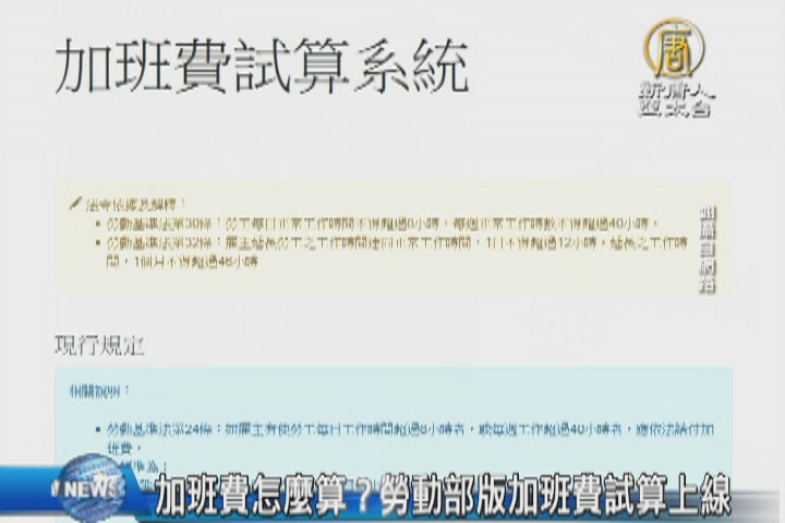 【新唐人亞太台 2016 年 07 月 21 日訊】立法院臨時會今天審查行政院版「一例一休」草案,而勞動部昨天傍晚在網站上推出了「加班費試算系統」,比較 現行法令、行政院版「一例一休」與在野黨「二例」不同版本下的加班費差異。勞動部取得網路社群「零時政府g0v.tw」的授權,將網友設計的「勞基法修法計算機」略作修改,趕在審查前一天將試算頁面放上網,有網友就說,這是不是勞動部想要為修法加溫,讓加班費試算網頁緊急上線。