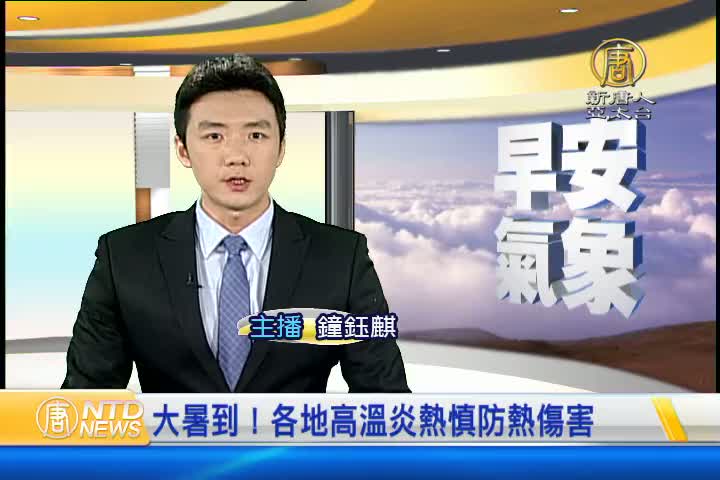 【新唐人亞太台 2016 年 07 月 22 日訊】歡迎您收看7月22日的早安新唐人,我是鐘鈺麒。先來帶您關心今天的天氣情況。今天是24節氣中的「大暑」,傳統中說,大暑前後,是一年當中天氣最熱的時候,因為太平洋高壓壟罩,各地依然晴朗炎熱,只有山區可能會有局部午後雷陣雨。氣溫方面,中部以北高溫35、36度,南部及東部33、34度,提醒民眾,外出活動須要注意防曬、補充水」,預防中暑。帶您一起來看到國際媒體重要訊息。