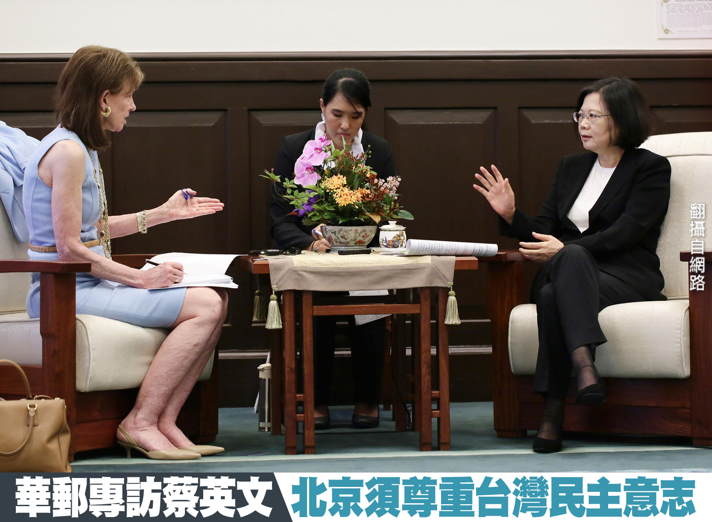 18日上午在總統府內接受,《華盛頓郵報》專訪,21日深夜《華盛頓郵報》以蔡總統說「北京須尊重台灣民主意志」為標,搶先在網路曝光專訪內容。
