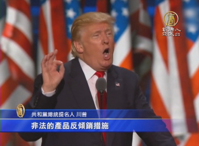 共和黨總統提名人 川普:「阻止中國(中共)的肆意情報盜竊,非法的產品反傾銷措施,赤字和貨幣操縱。他們是史上最大的貨幣操縱者。」