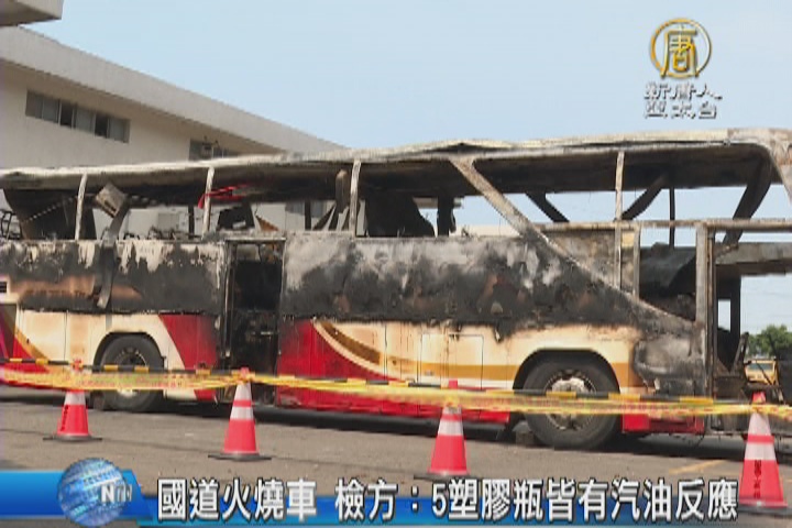 【新唐人亞太台 2016 年 07 月 24 日訊】檢方調查國道火燒車事件,今天(24)有重大突破!火燒的遊覽車上,採集到的塑膠瓶,檢驗後出現汽油類成分的反應,而且疑似裝有汽油的5支塑膠瓶,分別在駕駛艙、還有行李箱當中。到底是不是造成遊覽車迅速陷入火海的原因,還有待釐清。