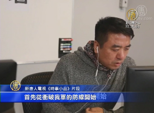 新唐人電視《時事小品》片段:「文鬥談統一,武鬥扔核彈,全憑一張嘴,狠話來洗版哪。好,帝吧哥,你先衝,我跟上,我們從哪兒開始啊?首先從衝破我軍的防線開始。啥?衝破我軍的防線?!噢對,就是先翻牆。」