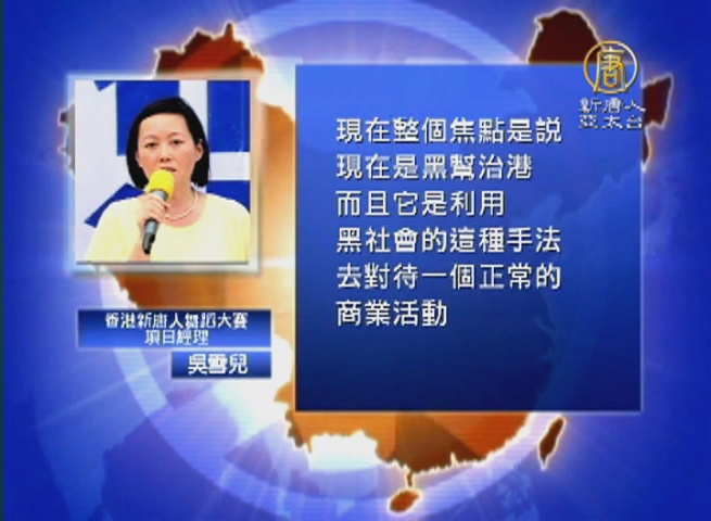 香港新唐人舞蹈大賽項目經理 吳雪兒:「現在整個焦點是說,現在是黑幫治港,而且它是利用黑社會的這種手法去對待一個正常的商業活動,對待一個正常的商業機構。這對香港是非常有傷害性的。」