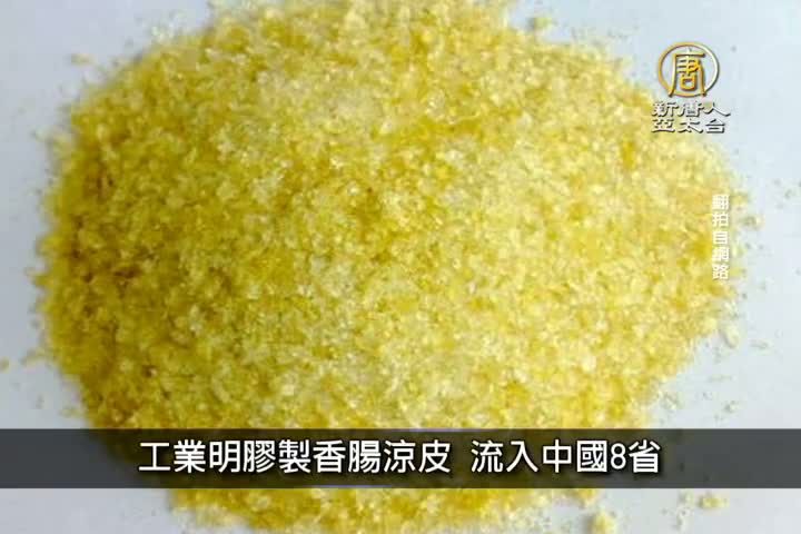 遼寧營口發現近億元的工業明膠被製成有毒的香腸、涼皮、皮凍,流向黑龍江、吉林、遼寧等8個省份數百個市鎮。專家表示,工業明膠用肉眼很難分辨,當中含有的鉻等重金屬一旦進入身體容易沉澱在血液骨骼中,很難排出體外。
