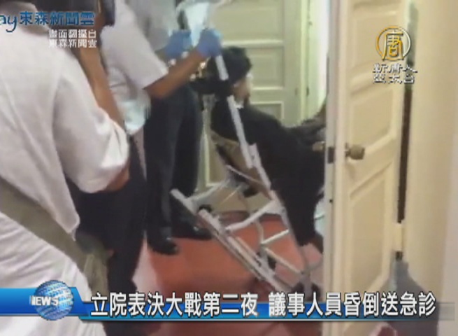 【新唐人亞太台 2016 年 07 月 27 日訊】立法院臨時會,持續上演千案表決大戰,原本即將進入第二晚挑燈夜戰,但傍晚六點左右,卻有一位宣讀提案的議事人員,突然昏倒,立法院也緊急叫來救護車,送台大醫院急診,立法院秘書長林志嘉稱,該議事人員昨天晚上九點下班,今天早上九點上班,工時符合勞基法,但因血壓低在洗手間暈倒,目前意識清楚。