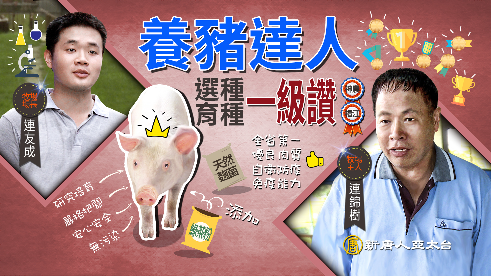 三十多歲就拿下神農獎、福江獎,連錦樹一路努力不懈也獲獎無數,歷年來爆發的口蹄疫、流行性下痢,他都因做好自衛防疫而安然無恙。他在1997年轉型飼養肉豬,但種豬與配種的研究還是持續不斷,透過選種和飼料調配,改良豬隻的免疫能力和肉質,更是技高一籌。