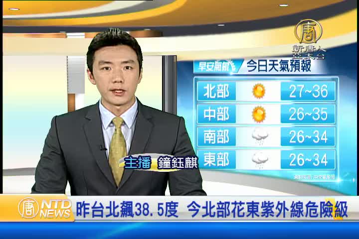 【新唐人亞太台 2016 年 07 月 28 日訊】歡迎您收看7月28日的早安新唐人,我是鐘鈺麒。先來帶您關心今天的天氣情況。昨天台北一度飆到38.5度,今天持續是高溫炎熱天氣。其中北部地區,還是會出現36度以上高溫,各地紫外線指數, 也都在過量級以上,提醒觀眾朋友記得多補充水分,做好防曬措施,避免中暑。帶您一起來看到國際媒體重要訊息。