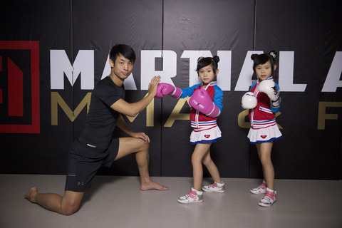 現場在教練的指導下,現學現賣開始打拳,學習速度快的「左左右右」,很快就進入狀況(豐華提供)