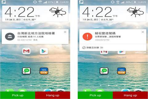 Whoscall正確來電畫面與疑似變造號碼來電畫面對比(精采提供)