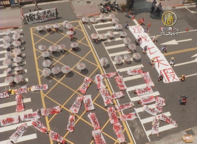 【新唐人亞太台 2016 年 07 月 29 日訊】再來看到,今天上午,大約100百名來自桃園市空服員工會等工運團體,在立法院群樓前抗議「砍七天假、一例一休」的草案,呼籲蔡英文總統保衛勞工123天的休假權益。