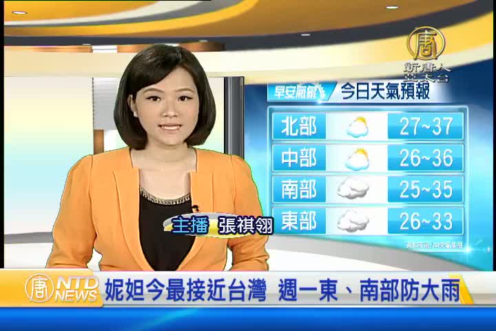【新唐人亞太台 2016 年 08 月 01 日訊】歡迎您收看8月1日的早安新唐人,我是張祺翎。先來帶您關心今天的天氣情況。又是一個星期的開始了,輕度颱風妮妲,昨晚到今天這段時間,最接近台灣, 受到外圍環流影響,東部及南部降雨 會變得比較明顯,提醒觀眾朋友嚴防局部大雨,另外,今天西部氣溫偏高,台北還是可能來到37度高溫,提醒觀眾朋友外出仍需注意防曬,多補充水分。帶您一起來看到國際媒體重要訊息。