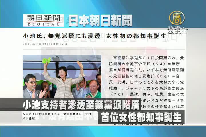 【新唐人亞太台 2016 年 08 月 01 日訊】來看到日本朝日新聞報導:日本東京首位女性都知事誕生,小池百合子支持者滲透至無黨派階層。