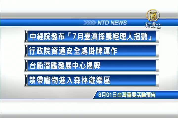 【新唐人亞太台 2016 年 08 月 01 日訊】接著看到,今天,8月1日,星期一,有哪些重要活動。首先是,中經院發布「7月臺灣採購經理人指數」。行政院資通安全處,今天掛牌運作。另外,台船潛艦發展中心今天揭牌。民生消息,避免狂犬病蔓延!從今天開始,禁帶寵物進入森林遊樂區。