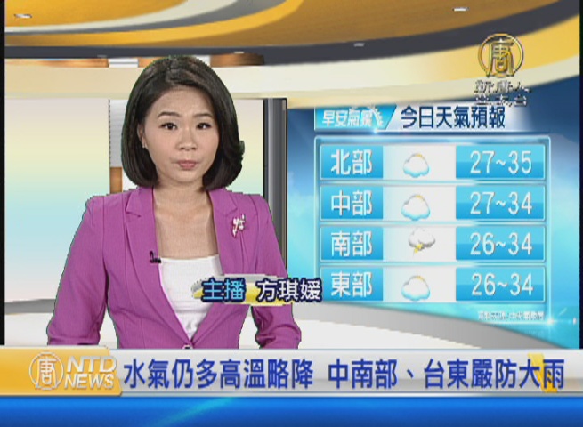 【新唐人亞太台 2016 年 08 月 02 日訊】歡迎您收看8月2日的早安新唐人,我是方琪媛。先來帶您關心今天的天氣情況。今天轉為偏南風,水氣仍多,東部、南部仍有短暫陣雨及雷雨,中南部及台東需嚴防局部大雨,各地高溫略為降低,約在32到35度。妮妲颱風已經登陸中國,但受到外圍環流及地形影響,台灣沿海、外島金馬的風浪仍大,提醒作業船隻避免前往海邊活動。帶您一起來看到國際媒體重要訊息。