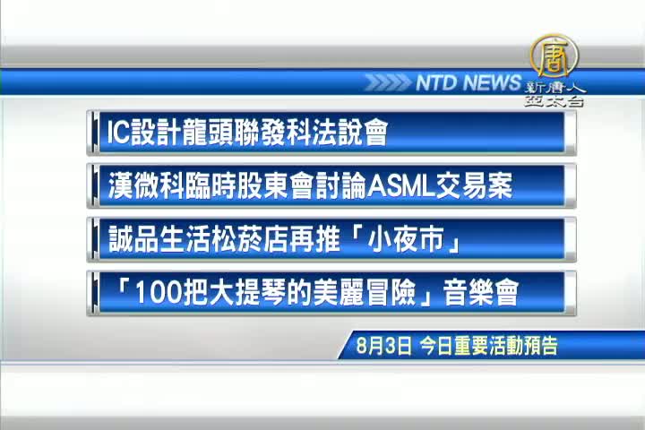 【新唐人亞太台 2016 年 08 月 03 日訊】接著看到,今天,8月3日,星期三,有哪些重要活動。首先是,IC設計龍頭聯發科舉行法說會;股后漢微科舉行臨時股東會,討論與荷商 艾司摩爾子公司100%股份轉換案交易案;另外,被CNN評為世界最酷百貨之一的誠品生活松菸店,再推出「小夜市」。最後是,「100把大提琴的美麗冒險」音樂會台南登場。
