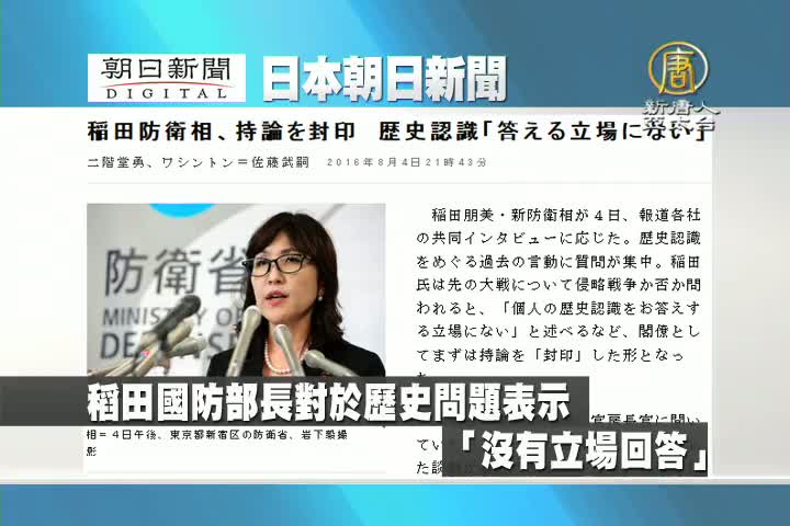 【新唐人亞太台 2016 年 08 月 05 日訊】來看到日本朝日新聞報導:日本新國防部長稻田朋美表示,對於歷史問題「沒有立場回答」,不發表自己的主張。