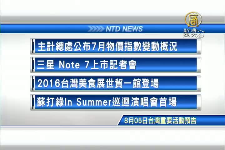 【新唐人亞太台 2016 年 08 月 05 日訊】接著看到,今天,8月5日,星期五,有哪些重要活動。首先是,主計總處公布7月物價指數變動概況;三星 Note 7上市記者會;2016台灣美食展世貿一館登場;以及,蘇打綠In Summer巡迴演唱會首場。