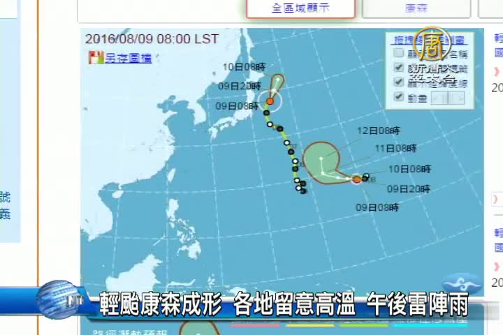 【新唐人亞太台 2016 年 08 月 09 日訊】來關心天氣,今天全台各地, 仍是艷陽高照,台北上午11點已經出現36.2度高溫。但受到琉球海面 熱低氣壓外圍雲系影響,西半部及東北部地區,有機會出現局部短暫陣雨或雷雨,其他地區則要留意午後雷陣雨。而原先在關島附近的熱低壓,今天清晨2點,已經增強為今年的第6號颱風「康森」,預計未來將朝日本東南方海面前進。
