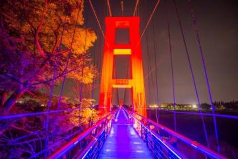 行嘉吊橋點燈,絢麗光彩變化,夢幻又迷人(嘉義市政府提供)