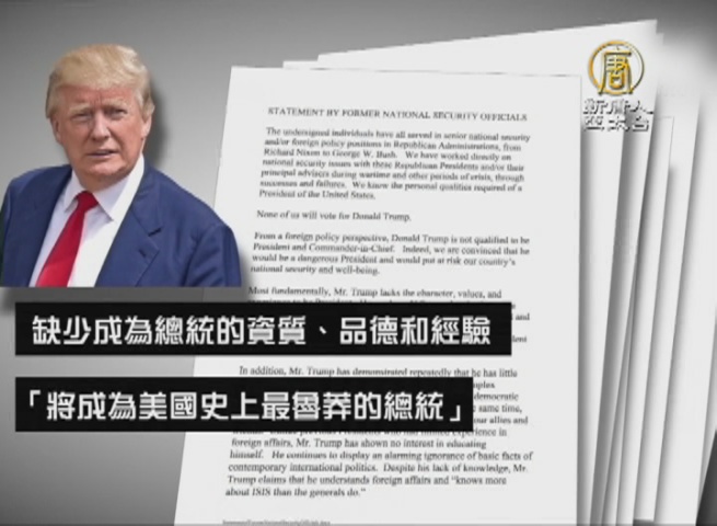 週一,五十名美國共和黨最高級別的國家安全官員,發出聯名信抵制川普做總統,稱他缺少成為總統的資質、品德和經驗。這些人很多是前任美國總統布什的高級助手和內閣成員。