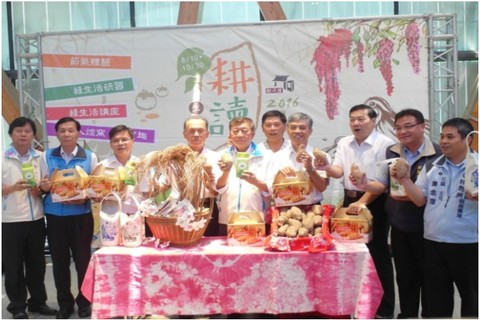 新瓦屋客家文化保存區,「2016耕讀生活趣」系列活動即將開跑。新竹縣長邱鏡淳(左五)和客委會副主委范佐銘(右四),邀請民眾一起體驗農耕的樂趣。(新唐人亞太電視記者 林秋霞攝)
