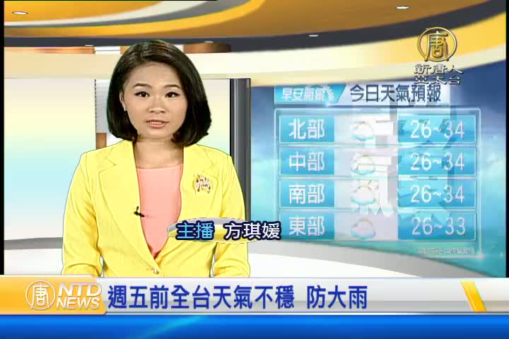【新唐人亞太台 2016 年 08 月 11 日訊】歡迎您收看8月11日的早安新唐人,我是方琪媛。先來帶您關心今天的天氣情況。受到熱帶低氣壓影響,今天天氣還是會趨向不穩定,今天各地高溫在33度和34度之間,星期五前,各地天氣不穩定有雨,提醒觀眾朋友準備雨具,留意天氣變化。帶您一起來看到國際媒體重要訊息。